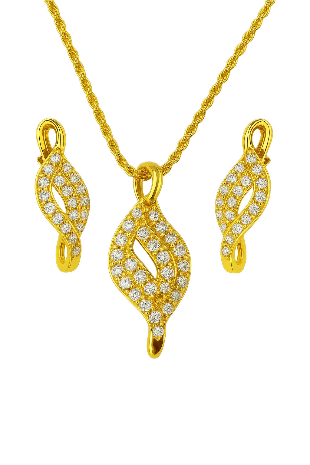 This showcases a pair of elegant 925 Silver drop earrings and pendant coated with yellow gold, each featuring a delicate paisley motif. The intricate gold plating work is adorned with a series of small, sparkling white stones, likely cubic zirconia, which enhance their luxurious appeal. Presented on a pristine white background, the high-resolution image highlights the fine craftsmanship and shimmering details of these beautiful accessories