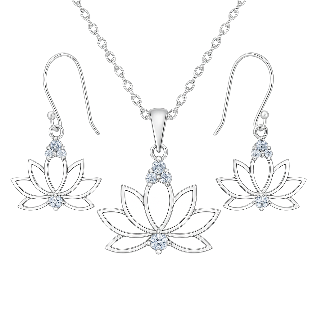 The image displays a finely crafted pendant and earrings made of 925 silver, featuring a central lotus flower design. Above the lotus, there are three smaller, round gemstones, possibly clear or white, arranged in a row. Below the lotus, a single, larger, tear-drop shaped gemstone, also appearing clear or white, dangles gracefully. The pendant is suspended from a delicate silver chain, suggesting it is part of a necklace. The overall design is elegant and intricate, highlighting both the metalwork and the subtle sparkle of the zircons.
