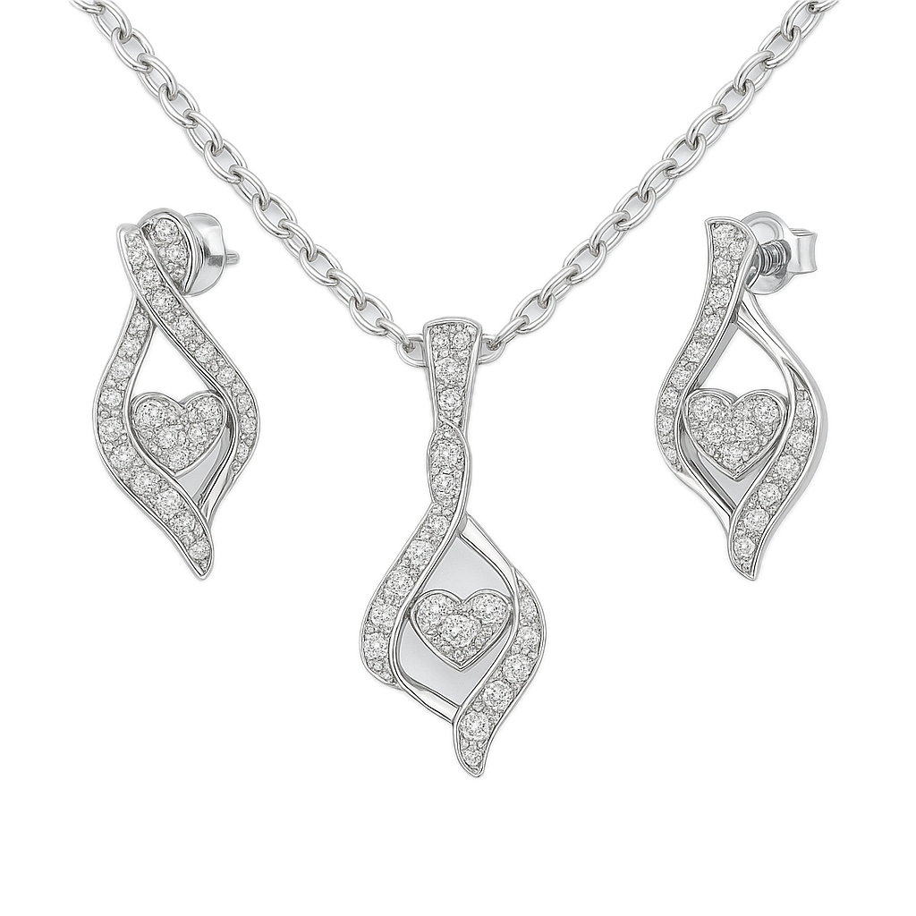 This elegant 925 silver pendant features a captivating twist design, adorned with numerous sparkling zircons. A central round-cut zircon is set within the gracefully twisted silver, creating a focal point that enhances its brilliance. The pendant is suspended from a delicate silver chain, making it a perfect accessory for everyday wear or special occasions. These exquisite 925 silver stud earrings showcase a unique twist design, encasing a pave-set zircon heart in the center of each earring. The flowing curves of silver are encrusted with an array of smaller zircons, complementing the central heart motif and adding to their radiant appeal. These earrings offer a blend of sophistication and romantic charm.